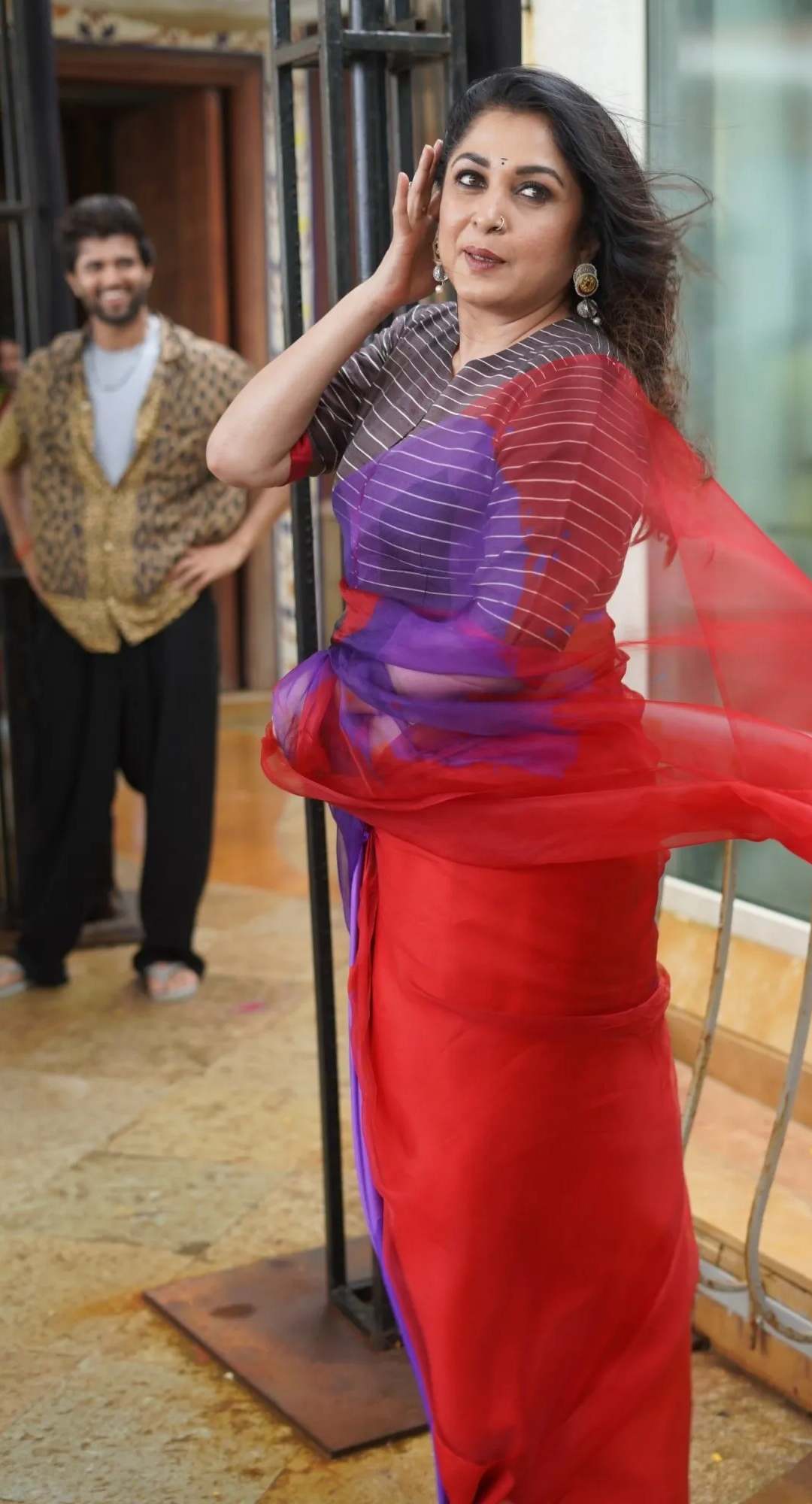 ramya krishna in a colour block saree by payal khandwala for liger promotions1.2The micro pleated saree displays itself in two distinct hues including violet and red. However, the colours are abstractly printed on the organza saree to achieve a stylish look. It is teamed up with a black silk blouse with gold stripes and red piping.